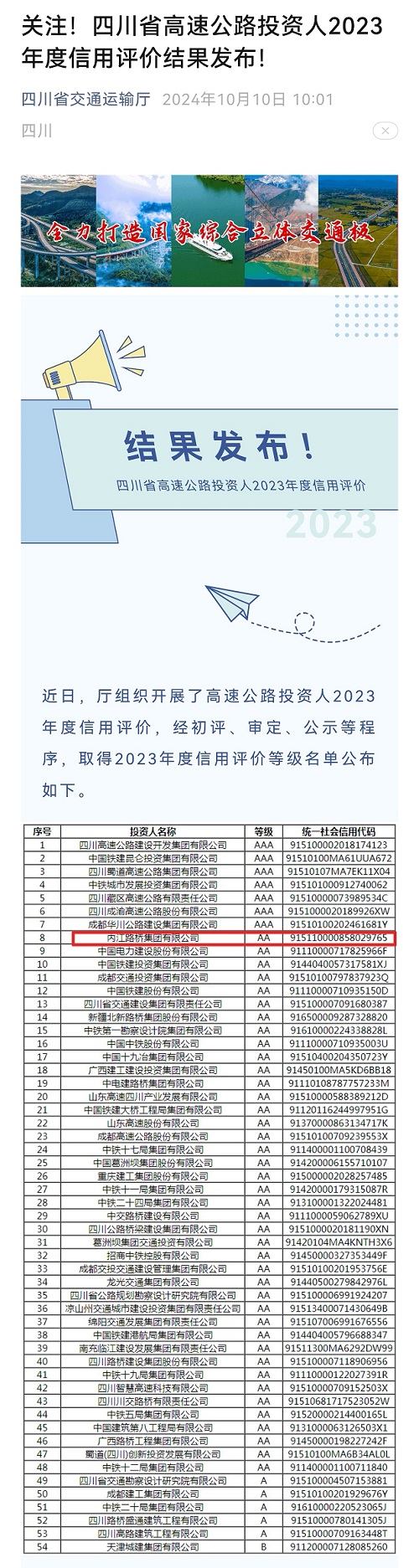 10月10日,四川省交通運(yùn)輸廳正式發(fā)布公告,內(nèi)江路橋集團(tuán)有限公司(以下簡(jiǎn)稱(chēng)“內(nèi)江路橋集團(tuán)”)成為內(nèi)江市唯一獲評(píng)四川省高速公路投資人2023年度信用評(píng)價(jià)等級(jí)AA級(jí)企業(yè)。這是繼2020年首次獲評(píng)該等級(jí)后,連續(xù)第四年蟬聯(lián)AA等級(jí)。